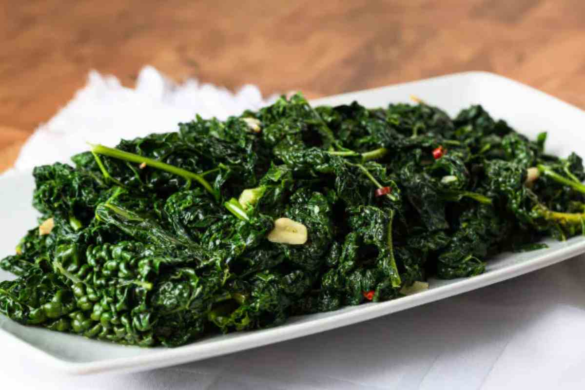 Dopo aver lavato 270 g di cavolo nero, eliminate la base del gambo e le coste centrali più dure. Le foglie più tenere si possono usare interamente, tagliandole a striscioline sottili per ridurre i tempi di cottura. Nel frattempo, portate a ebollizione una pentola capiente con acqua salata.