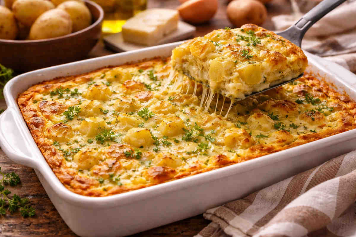 Questa frittata al forno è uno di quei piatti che preparo spesso proprio quando voglio recuperare qualcosa che è rimasto in cucina. Le patate già cotte diventano il cuore della ricetta e il formaggio filante rende tutto ancora più invitante.