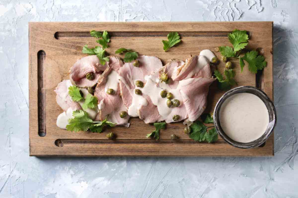 Elemento imprescindibile del vitel tonnè è la salsa, che in questa versione prende corpo grazie a un mix accurato di ingredienti: tonno sott’olio, uovo sodo, salsa al cren, maionese, senape al miele, acciughe e aglio in polvere. Tutto viene frullato fino a ottenere una crema vellutata e saporita. Lo chef suggerisce di aggiungere un po’ del fondo di cottura della carne, così da legare meglio i sapori.