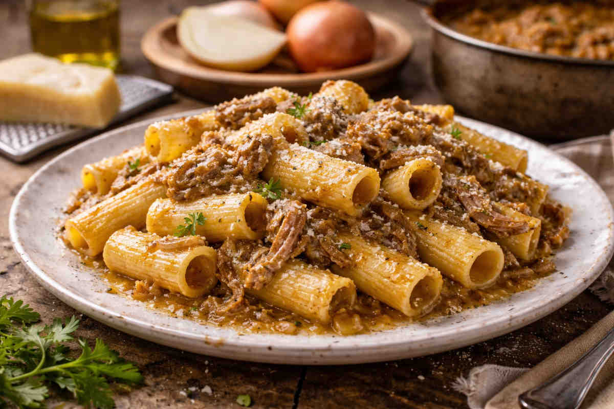 La ricetta tradizionale prevede pochi ingredienti, ma richiede tempo e attenzione. Cipolle, carne e olio cuociono lentamente per diverse ore, fino a creare un sugo intenso e profumato. Il risultato è una preparazione semplice ma straordinaria, perfetta per condire formati di pasta robusti come ziti spezzati o rigatoni.