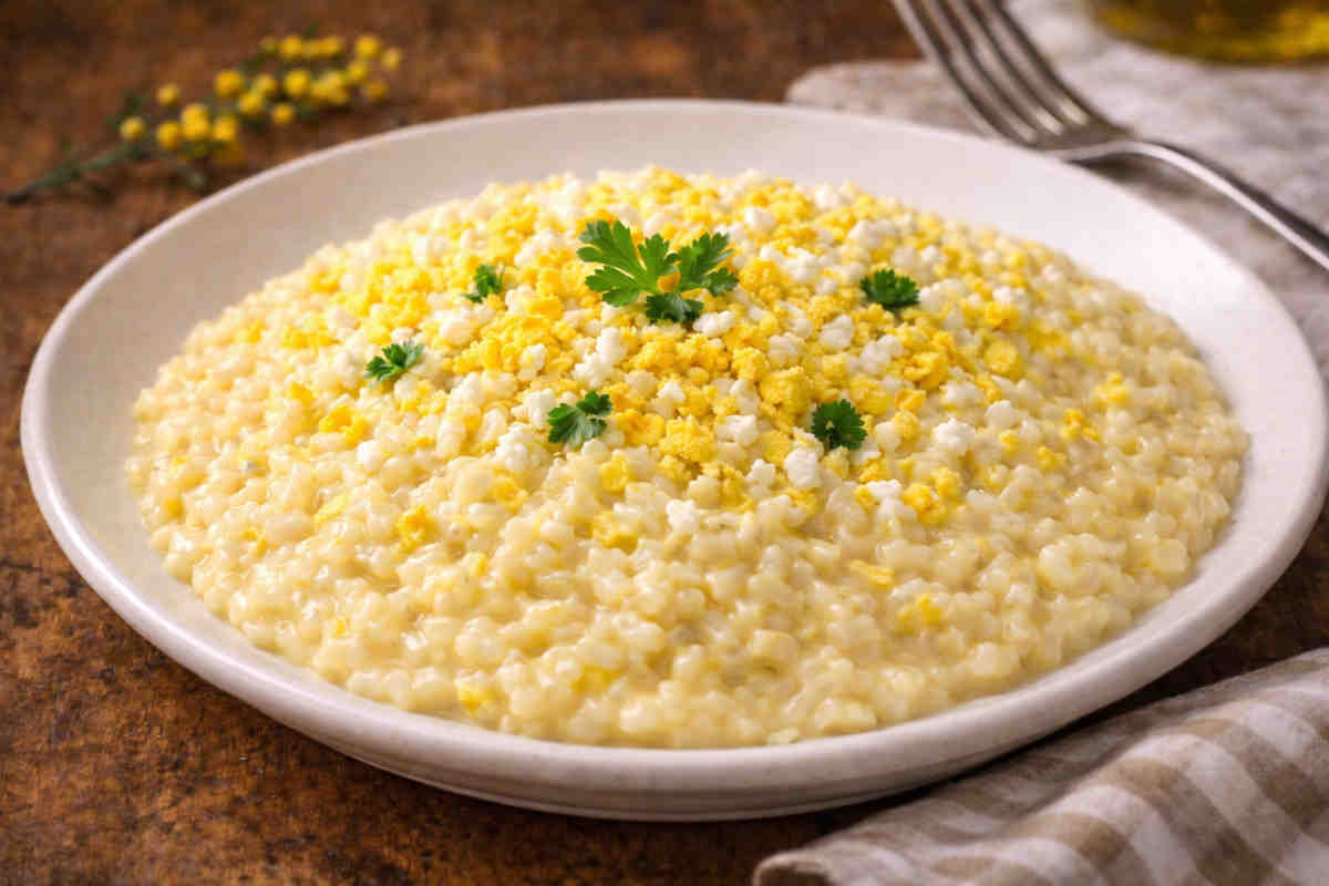 Il risultato sarà un piatto cremoso e delicato, con il contrasto perfetto tra il riso morbido e la consistenza leggera delle “briciole” di tuorlo che ricordano i piccoli fiori della mimosa.